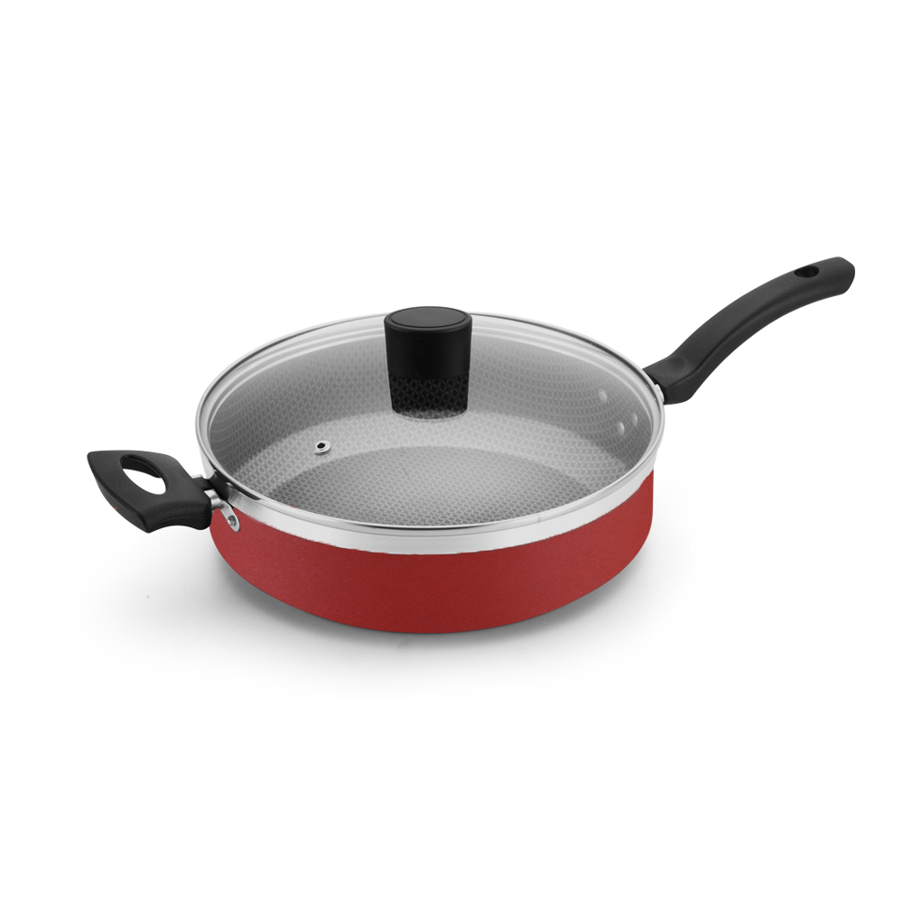 PRODUTO PRODUZIDO EM ALUMÍNIO LAMINADO, REVESTIDO INTERNO E EXTERNO COM ANTIADERENTE NOTA A - CABO E ALÇA EM BAQUELITE COM SUPORTE DE METAL - TAMPA EM VIDRO COM POMEL EM BAQUELITE